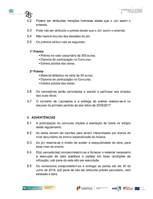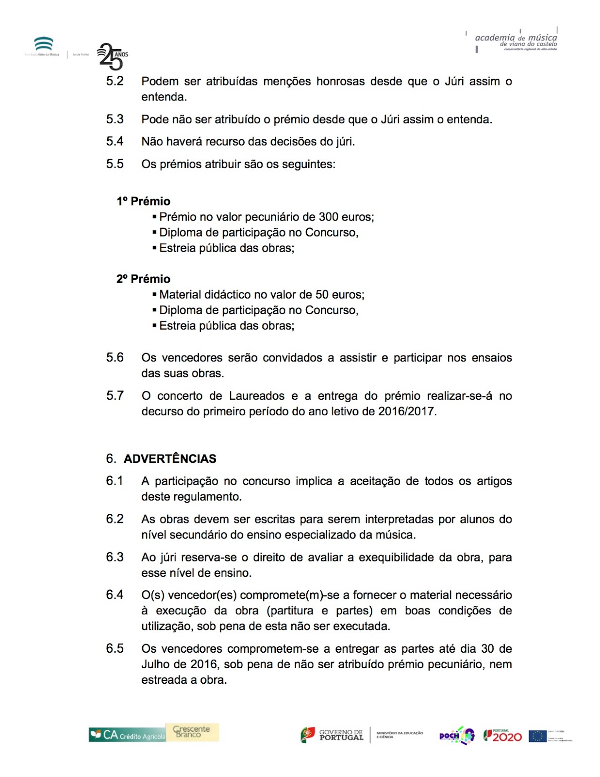2. Na presente edição serão admitidas a concurso obras de alunos dos Cursos Vocacionais e dos Cursos Profissionais de Música ministrados em Portugal. Para a admissão ao concurso é obrigatório que os candidatos estejam oficialmente inscritos no Curso Secundário/Complementar de Música ou Curso Profissional de Instrumentista de um Conservatório, Academia, Escola Profissional ou outra instituição de ensino de música reconhecida e autorizada pelo Ministério da Educação.